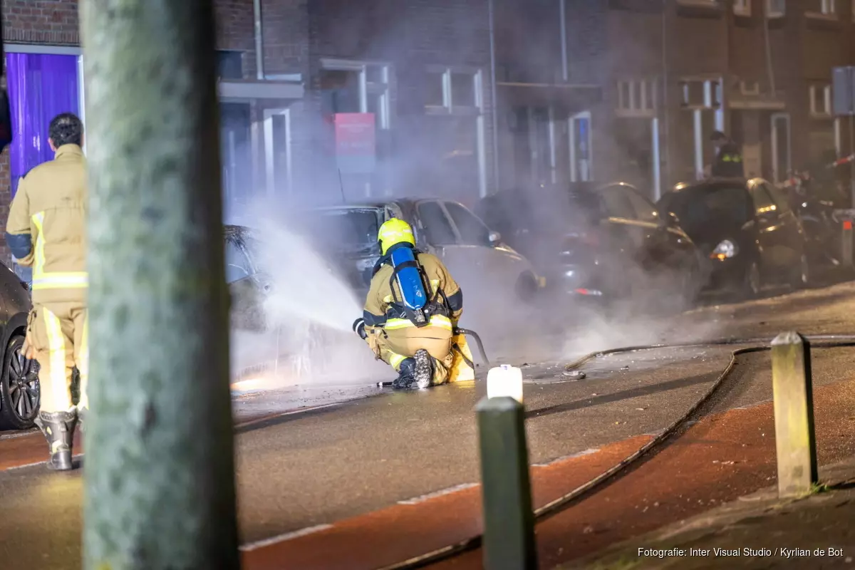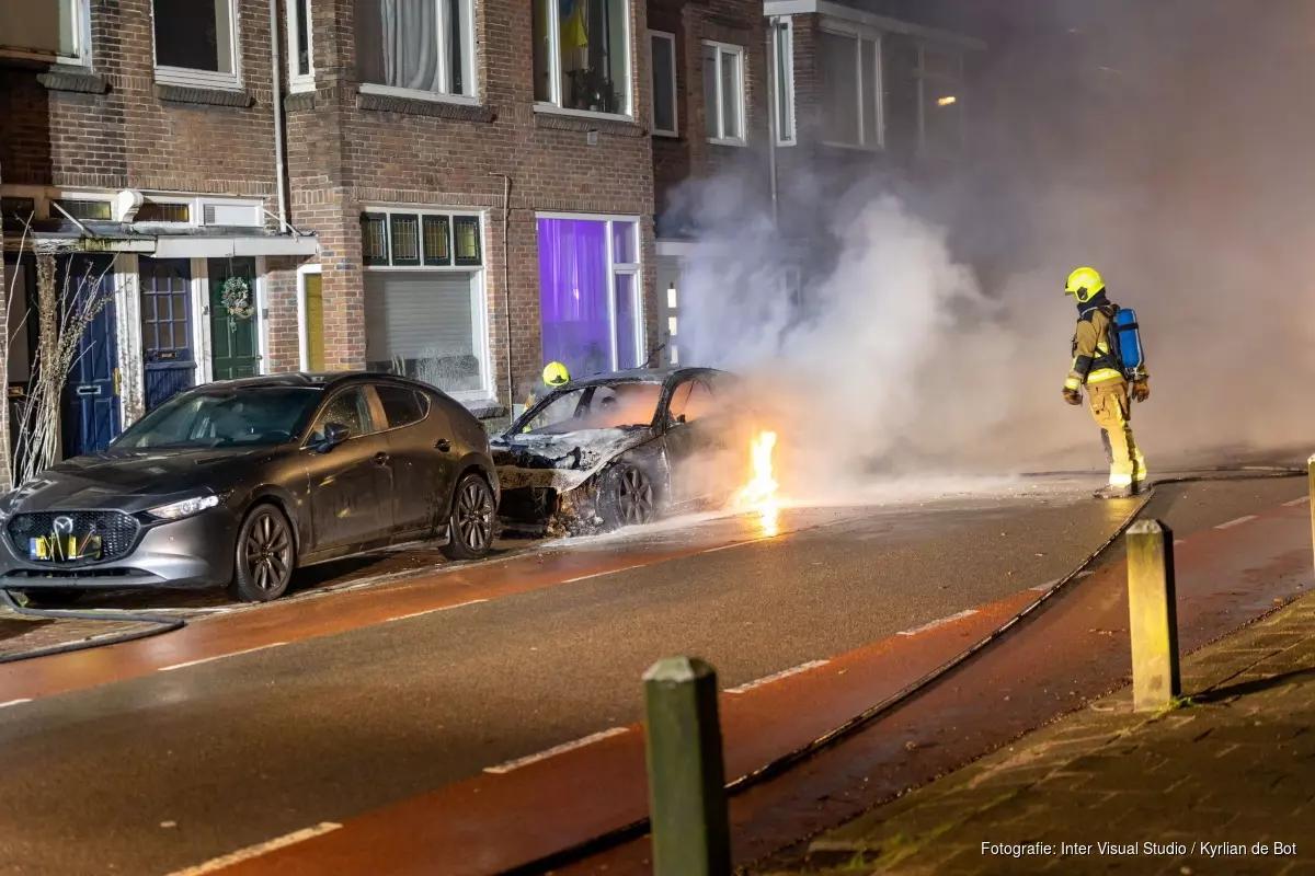 De brand vond slechts een meter van de huizen af plaats, maar niemand raakte gewond. De politie vraagt eventuele getuigen zichh te melden.