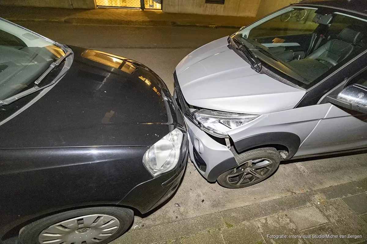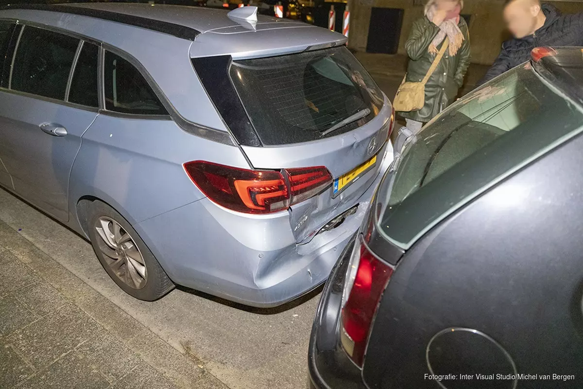 De politie is gealarmeerd om bij de aanrijding te assisteren. De geparkeerde voertuigen zitten met de trekhaak aan de bumper vast en de schade is hierdoor groot.