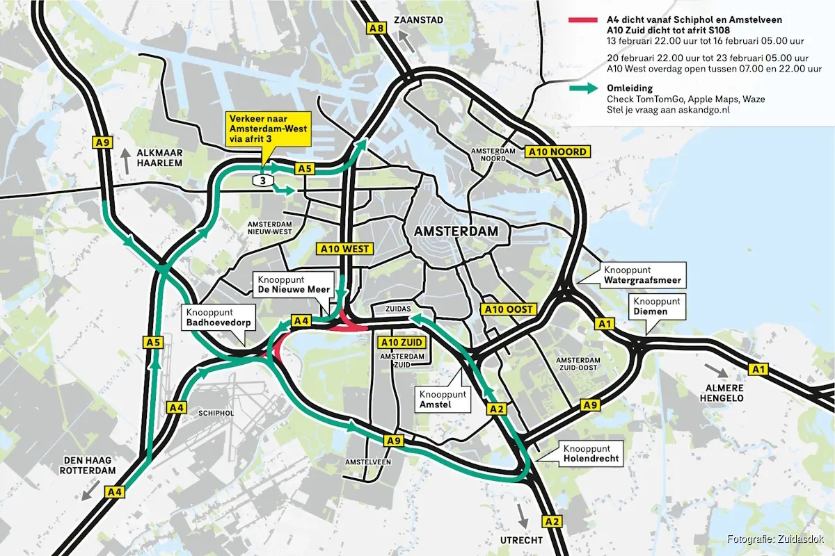 De (gedeeltelijke) afsluiting van de A4 start vrijdagavond 13 februari om 22.00 uur en duurt tot maandagochtend 16 februari 05.00 uur. Hetzelfde @jdschema geldt van 20 tot 23 februari. Het wegverkeer vanuit Schiphol kan omrijden via de A9 en A5 en vanuit Amstelveen via de A9 en A2. Wie de weg opgaat wordt aangeraden voor vertrek de route de checken op TomTom Go, Waze of Apple Maps. Reizigers kunnen reisadvies opvragen via Ask & Go of zich opgeven om via Whatsapp geattendeerd te worden op een aanstaande wegafsluiting.