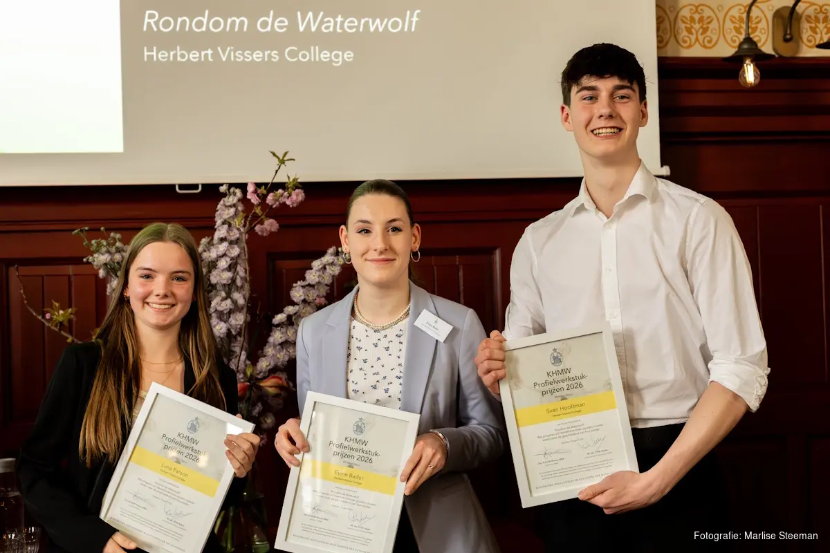 HAARLEM - Op woensdag 15 april zijn in het Hodshonhuis in Haarlem de KHMW Profielwerkstukprijzen 2026 uitgereikt. De Koninklijke Hollandsche Maatschappij der Wetenschappen (KHMW), het oudste wetenschappelijk genootschap van Nederland, stelt jaarlijks twee prijzen van elk € 500 beschikbaar voor de beste profielwerkstukken van havo- en vwo-leerlingen van scholen uit Haarlem en omgeving.