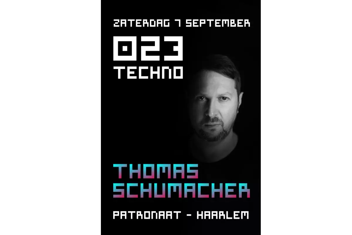 Na een dampend Veerplas Festival en een uitverkochte editie met Bart Skils presenteert 023TECHNO met gepaste trots een van de hotste techno-producers van het moment. De uit Berlijn afkomstige Thomas Schumacher staat al decennia lang garant voor de allerdikste dansvloer klappers. Al op zijn elfde raakte raakte hij geïnspireerd door het geluid van Depeche Mode. De dikke slepende sound van deze band is tot op de dag van vandaag terug te horen in zijn producties. Van zijn eigen Electric Ballroom tot zijn laatste producties op Noir Music. Thomas produceerde in de jaren 90 al monsterhits als ‘When I Rock’ en ‘ Heat it Up’ maar ook het afgelopen jaar werden zijn recente platen ‘Embody’ en ‘Stella’ grijsgedraaid door techno-heavy-weights als Adam Beyer en Amelie Lens. Met moddervette baslijnen doordrenkt met acid en een priemende kick weet Thomas als geen ander om de dansvloer tot het absolute kookpunt te brengen. Jetzt geht loss! NULL-ZWEI-DREI-TECHNO!